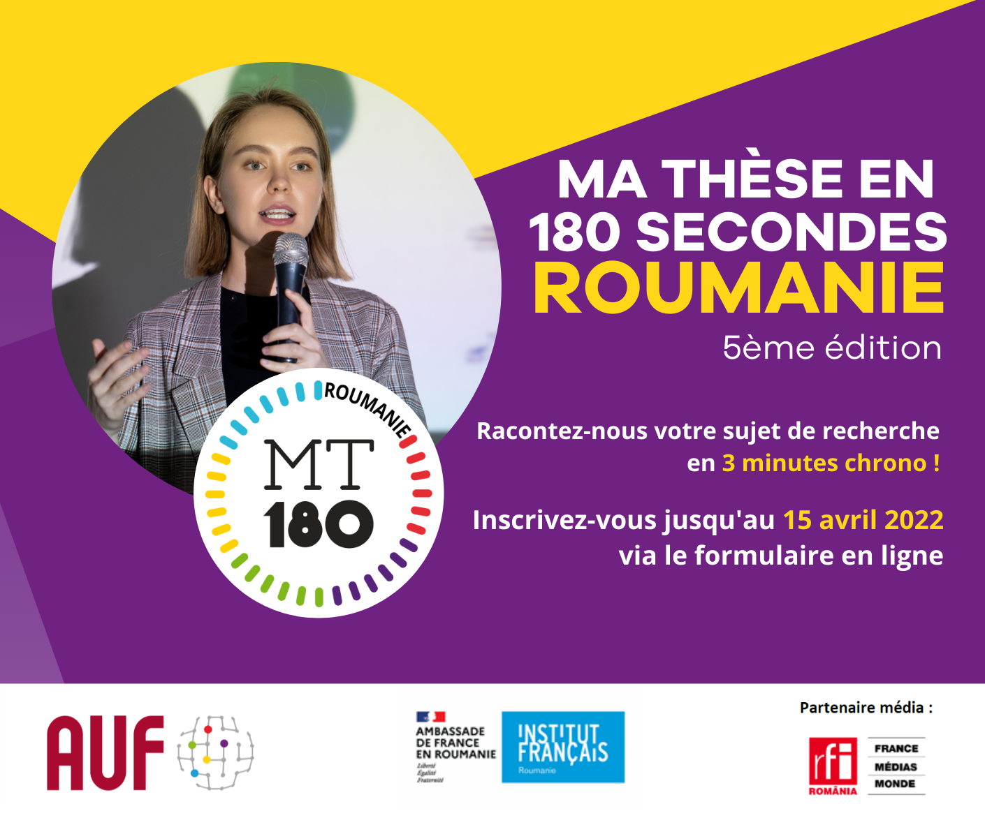 J’ai le plaisir de vous annoncer que l’appel à candidature pour la cinquième édition du concours « Ma thèse en 180 secondes » Roumanie est ouvert à partir d’aujourd’hui, 15 mars 2022, et jusqu’au 15 avril 2022.